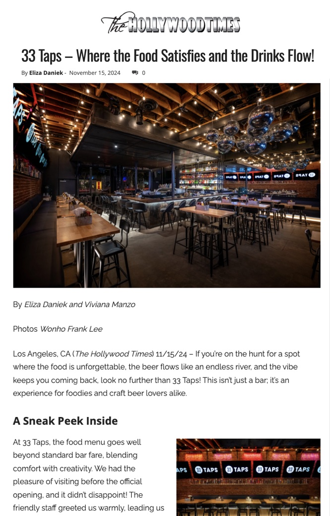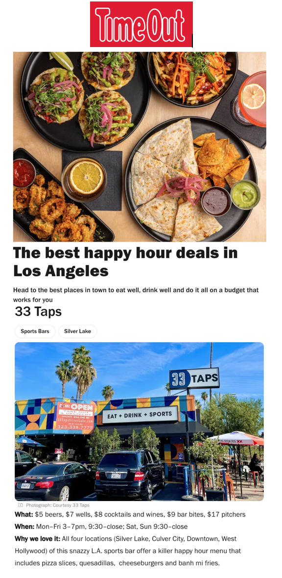Born and raised in Los Angeles, 33 Taps is a locally-owned sports bar and scratch kitchen with locations in Silver Lake, Culver City, Downtown LA, and West Hollywood. We've been serving beers, burgers, wings, and good vibes since 2016, and we're just getting started.
